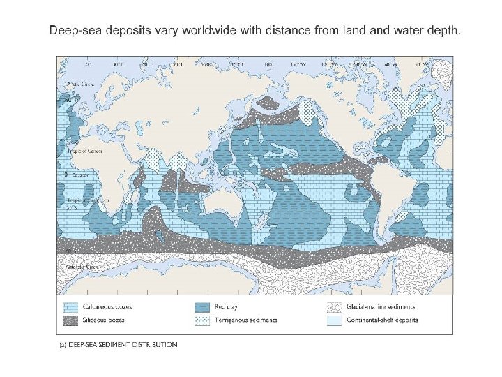 4 -2 Distribution of sediments in the deep ocean 1) latitude 2) distance from landmasses 3) CCD (carbonate compensation depth) • Glacial marine sediments occur in the high latitudes. • Pelagic clays occur far from land in the deepest water. • Calcareous oozes occur above the calcium carbonate composition depth. • The rate of sedimentation depends on the type of sediment in deep sea.
