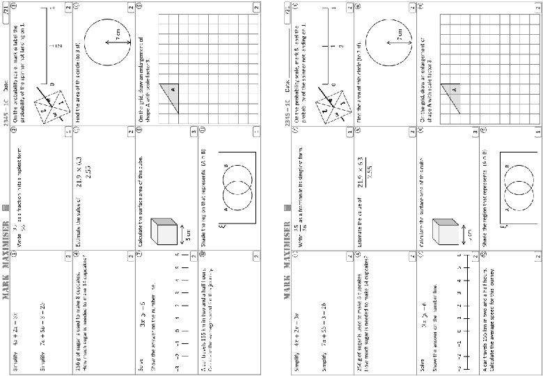 MARK MAXIMISER 2345 – 1 C ① Date: /21 ② On the probability scale, mark & label the ③ 1 2 ⑤ Find the area of this circle (to 3 sf). ⑥ probability of the spinner not landing on 1. 2 ④ Estimate the value of 256 g of sugar is used to make 8 cupcakes. How much sugar is needed to make 14 cupcakes? 7 cm Solve 2 2 2 ⑦ Calculate the surface area of this cube. ⑧ On the grid, draw an enlargement of ⑨ shape A with scale factor 3. Show the answer on the number line. − 3 − 2 − 1 0 1 2 3 4 5 2 A car travels 155 km in two and a half hours. Calculate the average speed for this journey. A 6 5 cm 3 ⑩ Shade the region that represents (A ∩ B) ξ 2 A ⑪ B 1 2