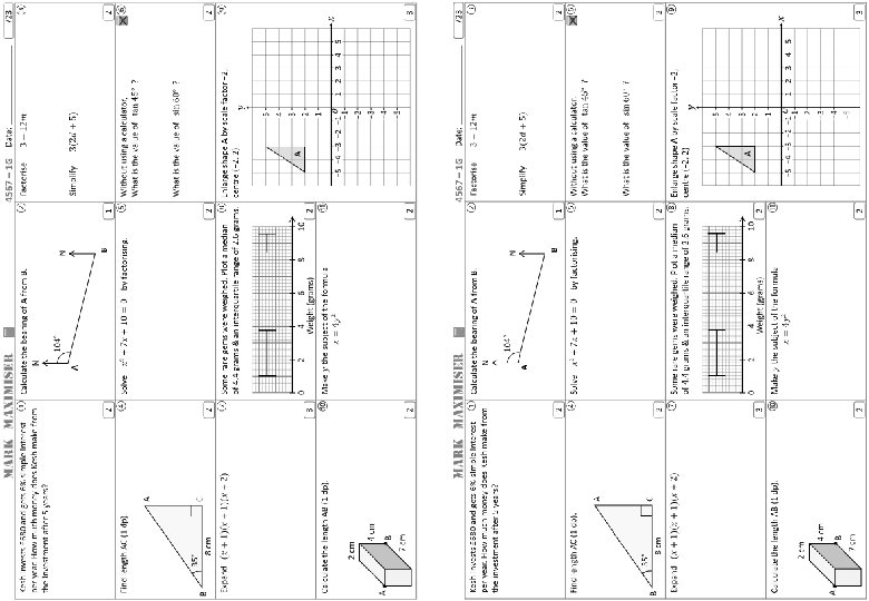 MARK MAXIMISER 4567 – 1 G Kesh invests £ 680 and gets 6% simple interest ① Calculate the bearing of A from B. per year. How much money does Kesh make from N the investment after 5 years? 104° 6% of £ 680 = £ 40. 80 ② N 76° A £ 40. 80 × 5 = £ 204 B 2 ④ Find length AC (1 dp). A 35° 8 cm C /23 ③ 1 ⑤ 2 ⑥ AC = 5. 6 cm B 284° Date: 2 2 2 ⑦ Some rare gems were weighed. Plot a median ⑧ Enlarge shape A by scale factor − 2, ⑨ of 4. 4 grams & an interquartile range of 2. 6 grams. centre (− 2, 2) 3 Calculate the length AB (1 dp). ⑩ 0 2 4 6 Weight (grams) 8 10 A 2 ⑪ 2 cm A 4 cm B 7 cm 2 2 3