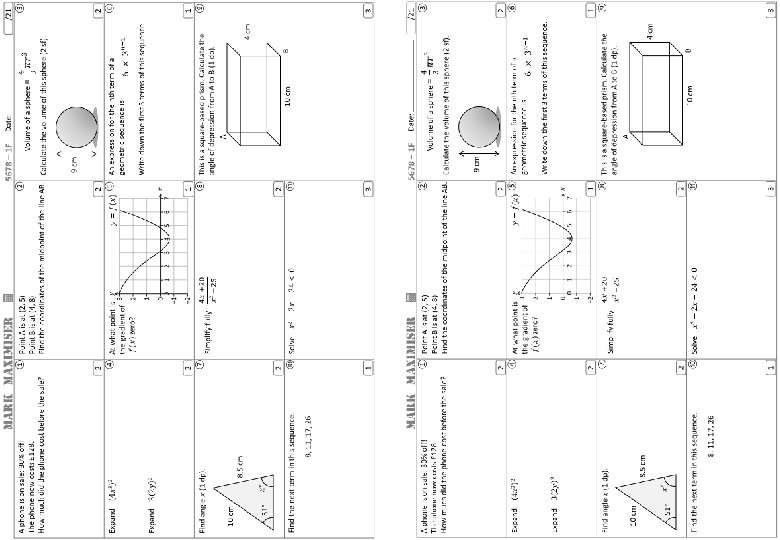 MARK MAXIMISER 5678 – 1 F Date: /21 ① Point A is at (2, 5) ② A phone is on sale: 30% off! The phone now costs £ 128. Point B is at (4, 8) How much did the phone cost before the sale? Find the coordinates of the midpoint of the line AB. Calculate the volume of this sphere (2 sf). 128 ÷ 0. 7 = £ 183. 86 (3, 6. 5) 2 ④ ③ 380 cm 3 9 cm 2 2 ⑤ An expression for the nth term of a ⑥ geometric sequence is Write down the first 3 terms of this sequence. (4, − 0. 5) 2 ⑦ 10 cm 51° 8. 5 cm Find the next term in this sequence. 1 ⑧ This is a square-based prism. Calculate the ⑨ angle of depression from A to B (1 dp). A 8, 11, 17, 26 1 4 cm 2 2 ⑩ ⑪ 38 1 10 cm B − 4 6 3 3