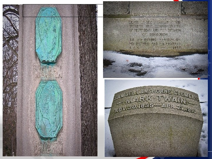 Mark Twain / Ossip Gabrilowitsch Monument • His grave is marked by a 12 -foot (i. e. , two fathoms, or "mark twain") monument, placed there by his surviving daughter, Clara. There is also a smaller headstone. "Death is the starlit strip between the companionship of yesterday and the reunion of tomorrow. " To the loving memory of my father and my husband CCG 1937