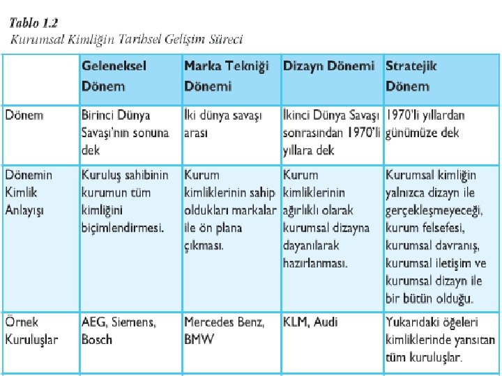 TÜRKIYE’DEKI TARIHSEL GELIŞIM IV Geleneksel dönem anlayışından sıyrılarak, çağdaş kurum kimliği anlayışını uygulayan bu öncü kuruluşlar kurum kimliği anlayışını başarıyla sürdüren kurumlardır. Ülkemizde kurum kimliği anlayışı Avrupa’dakinden çok da farklı olmadığını söylemek olasıdır.