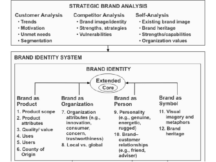 Markanın Yapısı Öz, tüketiciler tarafından kolayca anlaşılan, değerlendirilen, ayırt edilen, tek ve basit bileşen; değer, markanın kişiliğidir. (Marka kimdir, tüketiciye ne hissettirir? ) Yararlar, markaya ait, hatırlanması zor duygusal bileşenlerdir. (Marka tüketici için ne yapar, hangi ihtiyacını giderir, ürün tüketici için ne anlama gelir? ) Özellikler, markanın karşılaması gereken ihtiyaç ve isteklere göre durumunun tespitidir. (Nedir, ne içerir, tavsiye edilebilir mi? )