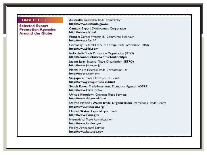 ENTRY AND DEVELOPMENT STRATEGIES Exporting and Importing § Indirect Involvement § Direct Involvement § International Intermediaries Can assist with troublesome yet important details such as documentation, financing and transportation • Export Management companies-Domestic companies that specialise in performing international business services as commision representatives or as distributors Expansion of Trading Companies Export Trading Company (ETC) Private Sector Facilitators Public Sector Facilitators © Photo. Disc