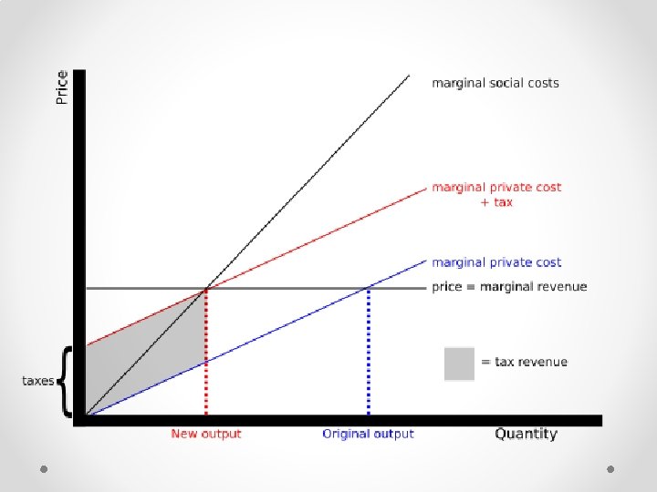 Pigouvian tax • A Pigouvian tax is a tax applied to a market activity that is generating negative externalities. The tax is intended to correct an inefficient market outcome, and does so by being set equal to the negative externalities • Problem: determination of the tax, measurement of social cost is almost impossible