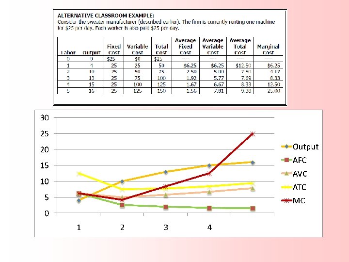 Cost • To have an understanding of how businesses act, it is necessary to understand a few things about costs. • For a normal business, the cost of making something comes from fixed costs (FC) and variable costs (VC). • We can divide the number of products into these costs to get average costs per item, ie. Average Fixed Cost (AFC), Average Variable Cost (AVC). • We can add AFC and AVC together to get Average Total Cost (ATC). • We also want to look at the marginal costs (the amount of difference it takes to make the next item).