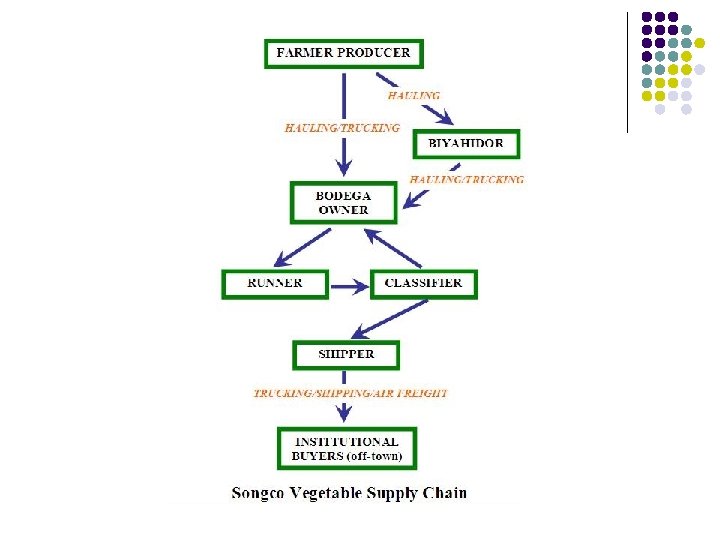 l Farmers cannot maximize profits as they do not get good prices for their goods l l No control over the occurrence of oversupply in the market. Quality of goods is compromised during hauling/ handling and transporting/trucking. Only market agents have command over vegetable pricing; financing obtained from them limits farmers’ leverage for price negotiation. Harvesting is/can not be properly timed due to force majeure.