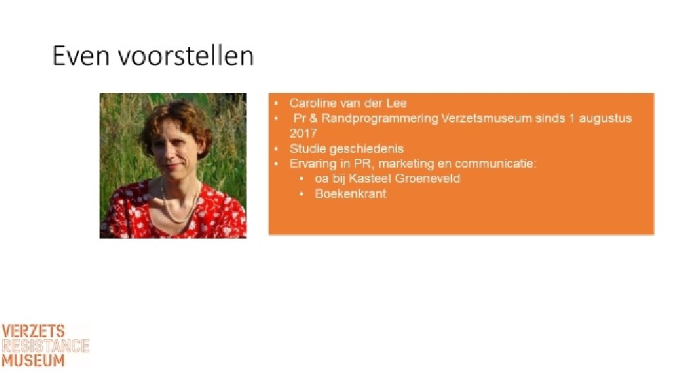 Marketing in het Verzetsmuseum • Wat is marketing • Marketing in Verzetsmuseum • Doel van de marketing • Eerdere doelen • PR vragen • Doel, strategie • Marketing doelgroepen • Aanpak