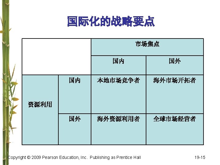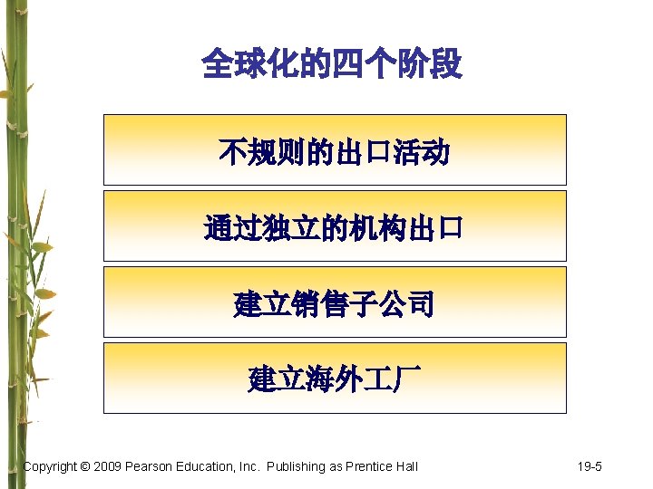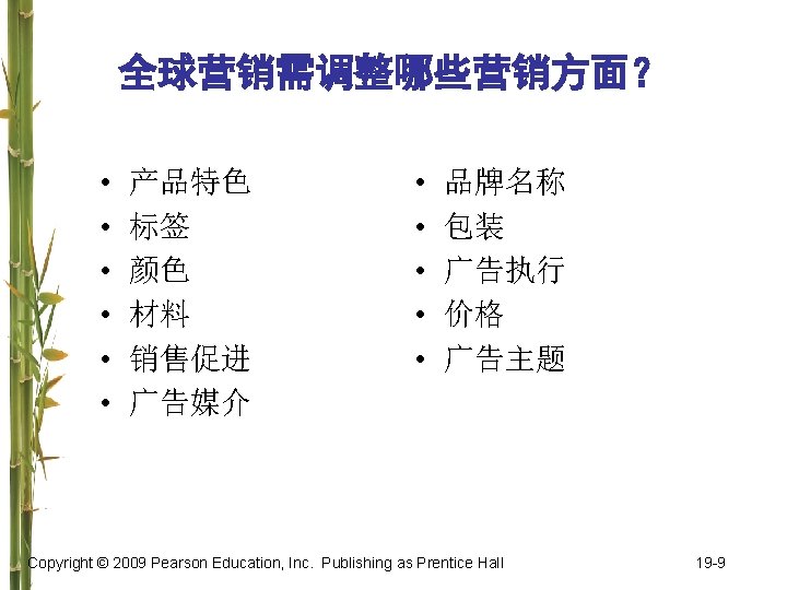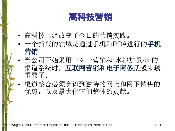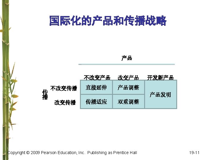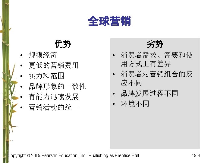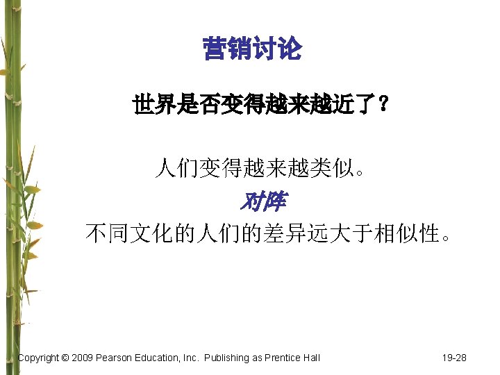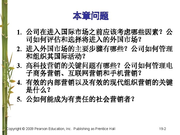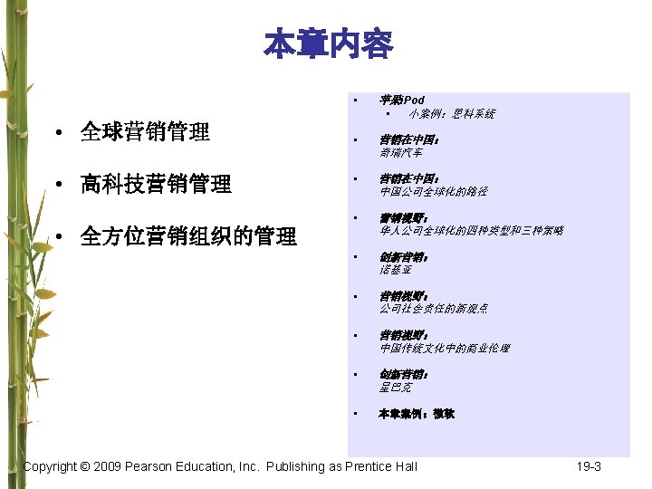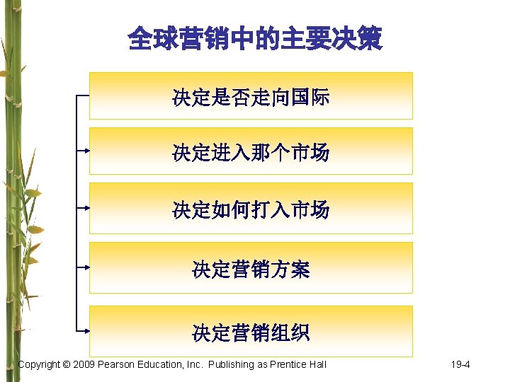 MARKETING MANAGEMENT IN CHINA 19 Philip Kotler Kevin Slides: 31 Download presentation MARKETING MANAGEMENT IN CHINA 营销管理(中国版) 第 19章 新世界的营销管理 菲利普·科特勒 - 凯文·莱恩·凯勒 - 卢泰宏 Philip Kotler – Kevin Lane Keller – Lu Taihong 关键的发展中市场: BRICS 中国 印度 俄罗斯 巴西 南非 Copyright © 2009 Pearson Education, Inc. Publishing as Prentice Hall 19 -6 文化维度 个人主义 vs. 集体主义 高 vs. 低 权力距离 男子主义 vs. 女子主义 弱 vs. 强 不确定性规避 Copyright © 2009 Pearson Education, Inc. Publishing as Prentice Hall 19 -10 产品调整的水平 • 区域版 • 国家版 • 城市版 • 零售商版 Copyright © 2009 Pearson Education, Inc. Publishing as Prentice Hall 19 -12 价格选择 • 各地统一价 • 各国设基于市场的价格 • 各国设基于成本的价格 Copyright © 2009 Pearson Education, Inc. Publishing as Prentice Hall 19 -13 全球营销的全渠道观念 卖方 全球总部 国家间渠道 各国国内渠道 最终购买者 Copyright © 2009 Pearson Education, Inc. Publishing as Prentice Hall 19 -14 全球组织战略 全世界作为一个市场 跨国经营 本土化 Copyright © 2009 Pearson Education, Inc. Publishing as Prentice Hall 19 -17 全访问营销组织的管理 • 内部营销 • 社会责任营销 • 善因营销 Copyright © 2009 Pearson Education, Inc. Publishing as Prentice Hall 19 -19 职能性组织 Copyright © 2009 Pearson Education, Inc. Publishing as Prentice Hall 19 -21 产品经理的互动 Copyright © 2009 Pearson Education, Inc. Publishing as Prentice Hall 19 -22 控制过程 我们要达到什么? 正发生着什么? 为什么会发生? 我们应如何应对? Copyright © 2009 Pearson Education, Inc. Publishing as Prentice Hall 19 -24 营销讨论 • 营销在中国: 中国公司全球化的路径 Copyright © 2009 Pearson Education, Inc. Publishing as Prentice Hall 19 -27 营销讨论 • 营销视野: 华人公司全球化的四种类型和三种策略 Copyright © 2009 Pearson Education, Inc. Publishing as Prentice Hall 19 -29 案例讨论 • 创新营销: 诺基亚 • 本章案例: 微软 • 创新营销: 星巴克 Copyright © 2009 Pearson Education, Inc. Publishing as Prentice Hall 19 -30 案例讨论 • 营销在中国: 奇瑞汽车 • 营销在中国: 中国公司全球化的路 径 Copyright © 2009 Pearson Education, Inc. Publishing as Prentice Hall 19 -31