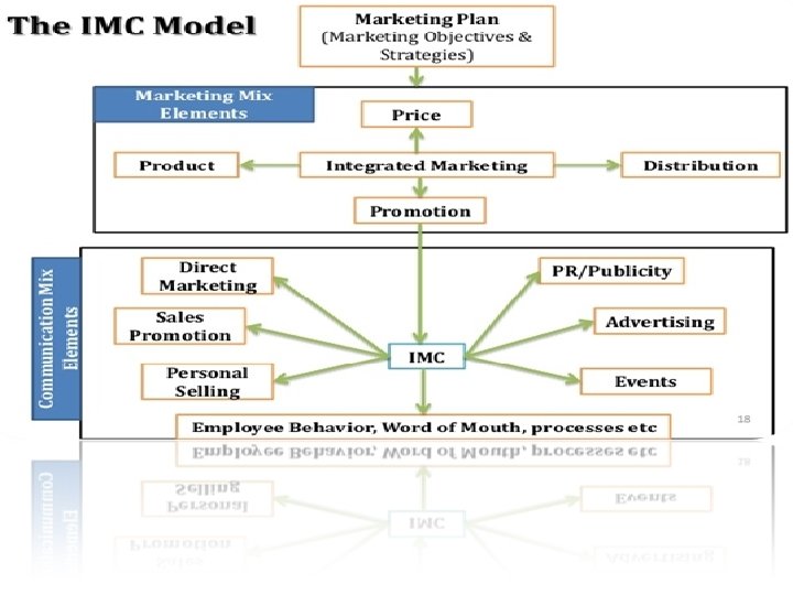 • Istilah Integrated Marketing Communication (IMC) merupakan pengembangan dari istilah promosi. Kata “promosi” berkonotasi arus informasi satu arah, sedangkan Integrated Marketing Communicationlebih menekankan pada interaksi dua arah. Konsekuensinya, promosi dipersepsikan sebagai bentuk komunikasi yang bersifat massal, sedangkan Integrated Marketing Communication (IMC) lebih bersifat personal atau individual. • Integrated Marketing Communicationmenurut America Association Of Advertising Agenciesadalah konsep perencanaan komunikasi pemasaran yang mengakui nilai tambah suatu rencana yang komperehensif • Integrated marketing communication adalah bagian dari kegiatan marketing yang timbul dikarenakan kebutuhan dari produk untuk mengkomunikasikan diri kepada target audience atau konsumennya. • Suatu produk diciptakan atau diproduksi dengan suatu tujuan marketing yaitu pada umumnya agar produk laku dipasaran. Untuk mencapai tujuan ini tentunya harus dilakukan usaha dan beberapa proses sebelum mencapai tujuan tersebut. • • • Ciri-ciri IMC 1. Mempengaruhi perilaku 2. Berawal dari pelanggan dan calon pelanggan 3. Menggunakan seluruh bentuk kontak / bentuk konsumen 4. Menciptakan sinergi