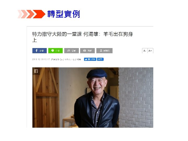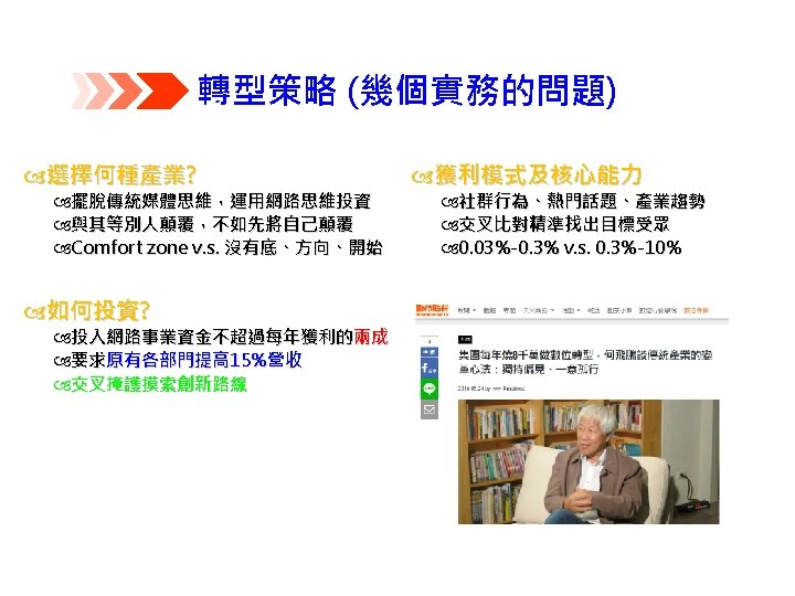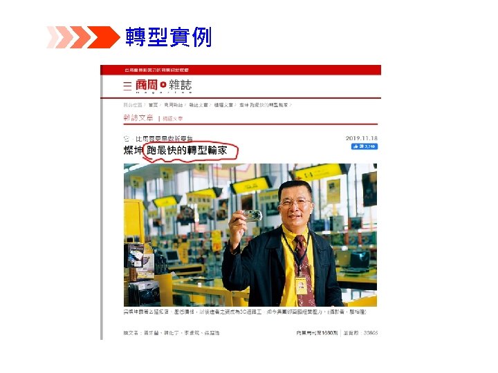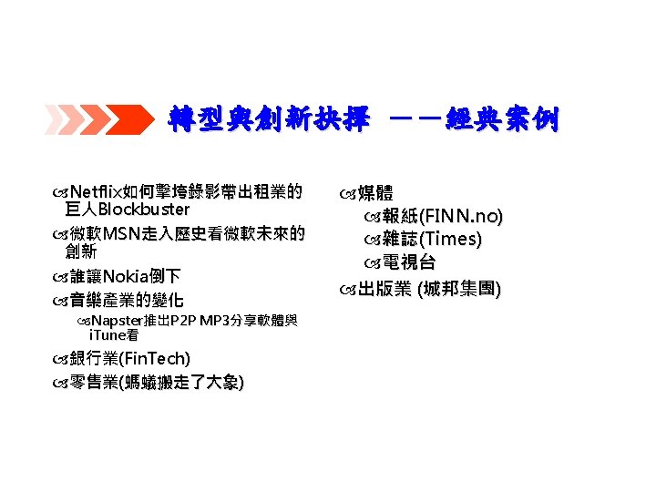 轉型與創新抉擇 --創新兩難 影音平台(Youtube, Netflix) 音樂(MP 3, i. Tune) 報業(Craiglist, Schibsted FINN. no) 出版( 城邦 Barnesnobel) 媒體(電視台、 有線電視) 通訊(電話、手機、智慧型手 機: Nokia HTC Blackberry) 汽車業 (Telsa) 零售業(Iot, Amazon, Walmart) 金融業(Fin. Tech) 廣告業 製造業(Industry 4. 0) 行銷(Marketing 4. 0) 教育