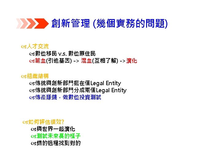 . Ambidexterity (雙元創新) Core exploitation exploit the profits earned from the original/existed strengths Manage Company Routine Performance Efficiency Innovation explore innovative businesses for future profits Reshape Company Creative Learning Risk How To ?