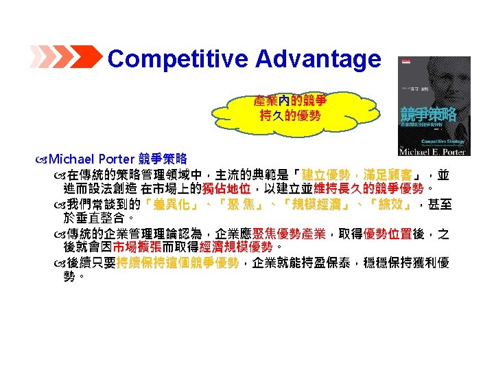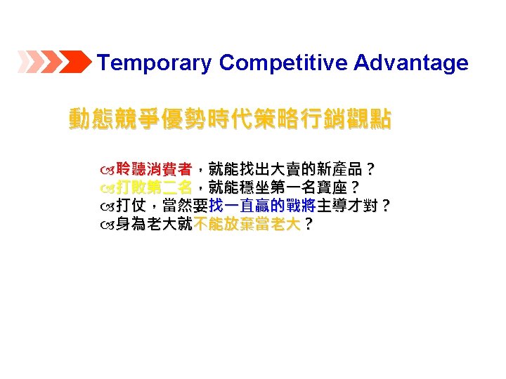 Temporary Competitive Advantage “exploiting temporary competitive advantages, not sustainable ones. ” Industry va. Arena On v. s. Off, i. Tune Netflix v. s Blockbuster When the rule is changing, the best way is to redefine next disruptive innovation