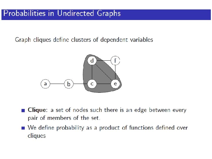Potential Function • Define the factors in the potential function by using the clique • Generally, consider the maximal cliques, because other cliques must be the subsets of maximal cliques