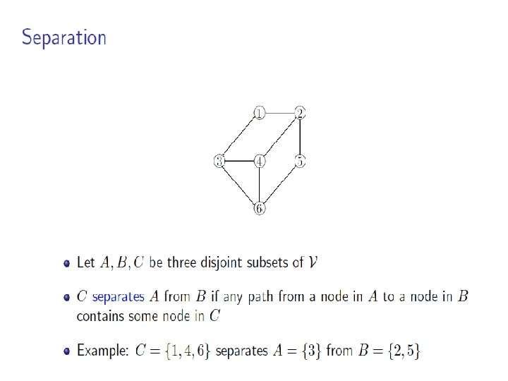 Conditional Independence Properties • In an undirected graph, there are three sets of nodes, denoted A, B, C, and A is conditionally independent of B given C • Shorthand notation: <=> p(A|B, C) = p(A|C) Conditional independence property