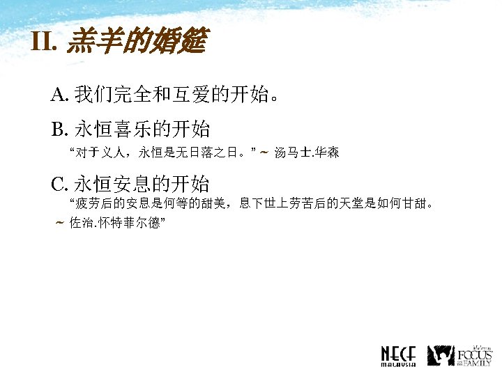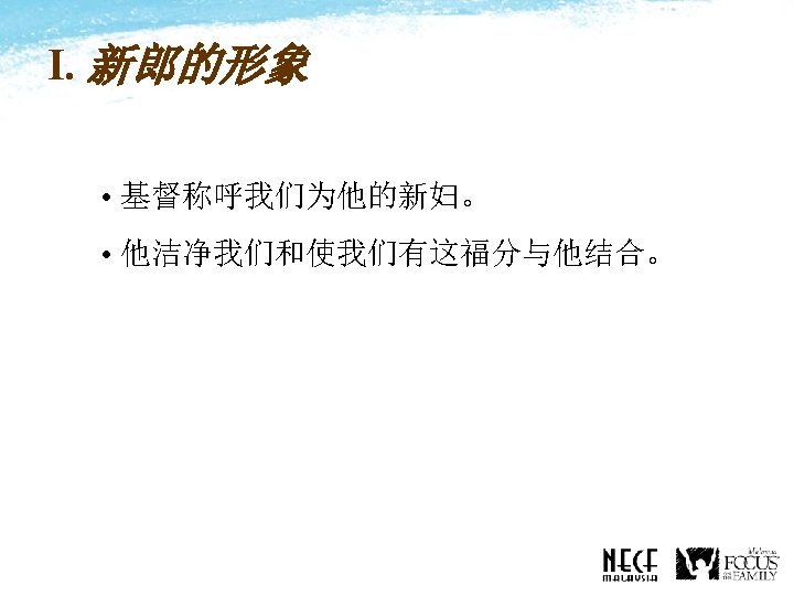 I. The Description of the Bridegroom • Christ call us as His bride. • He has purified us and made us worthy of our marriage to Him.