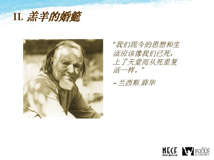 II. The Marriage Supper of the Lamb “Our thoughts and lives now we are to live as though we had already died, been to heaven, and come back again as risen. ” ~Francis Schaeffer