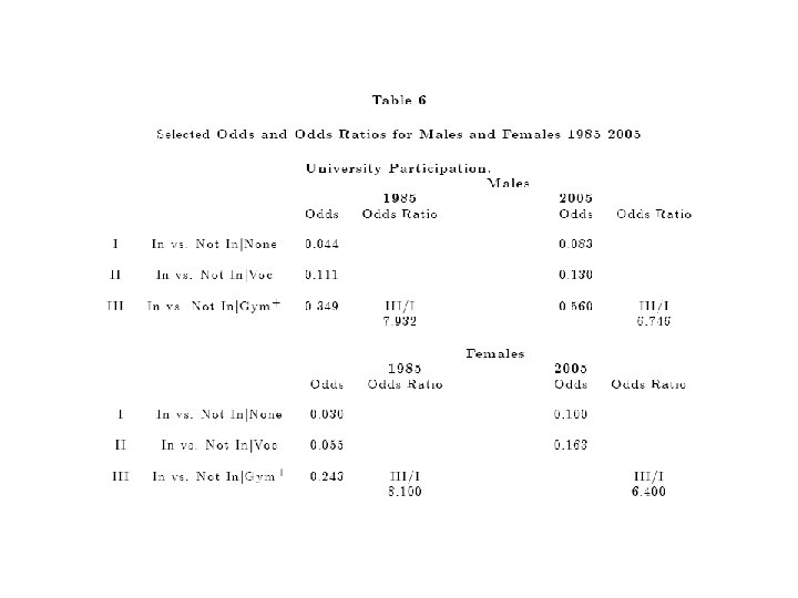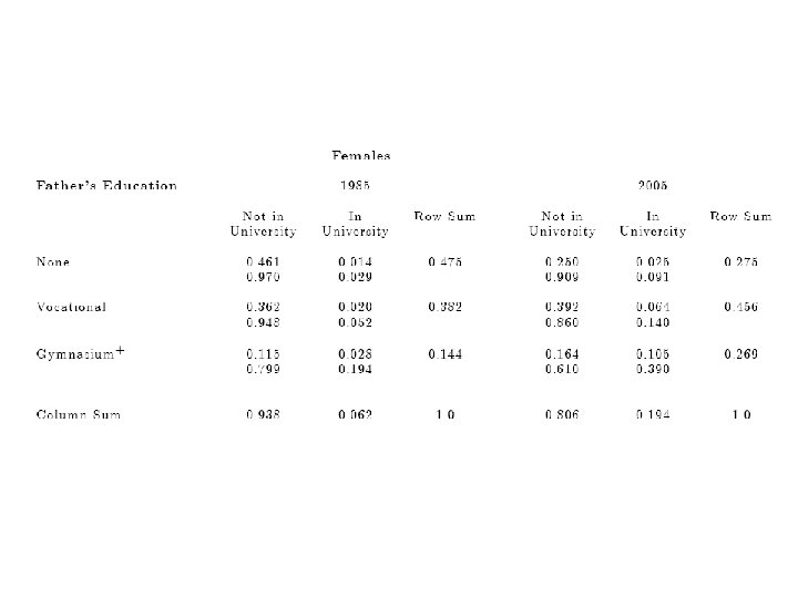 Mc. Intosh og Munk 2012: fødselsårgange 1962 og 1982, mindre afhængighed af forældrebaggrund Mellem 1985 og 2005 ændrede chanceforholdet sig markant når de der fik en gymnasieuddannelse og ingen ungdomsuddannelse sammenlignes (sammenholdt med fædre med mindst en gymnasieuddannelse og ingen uddannelse). Akademisk gymnasium: Chanceforholdet gik for mænd fra en faktor 11 til en faktor 6½. Tilsvarende for kvinder, fra en faktor 6½ til godt 2!! Påbegyndelse af universitetsuddannelse: Chanceforholdet gik for mænd fra en faktor 8 til 6, 8. Tilsvarende for kvinder, fra en faktor 8 til godt 6, 4. Unge mennesker fra familier uden så mange ressourcer har fået bedre adgang til gymnasium og universitetsuddannelse og faktorer ikke relateret til observerbare familiekarakteristika er blevet mere betydningsfuld (formentlig generel social norm)