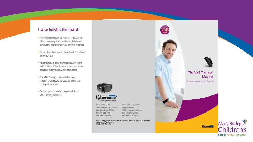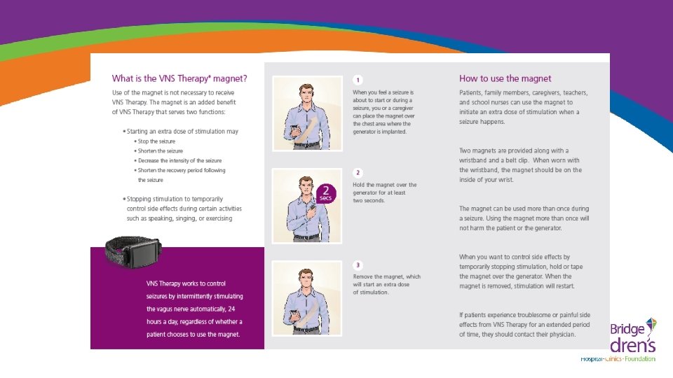 Vagal Nerve Stimulator Implanted device that works as a “Pacemaker” for the brain Runs 24/7 Has seizure detection capability Magnet capability to abort seizure Can prevent a seizure Can stop a seizure Can decrease seizure frequency , intensity and duration