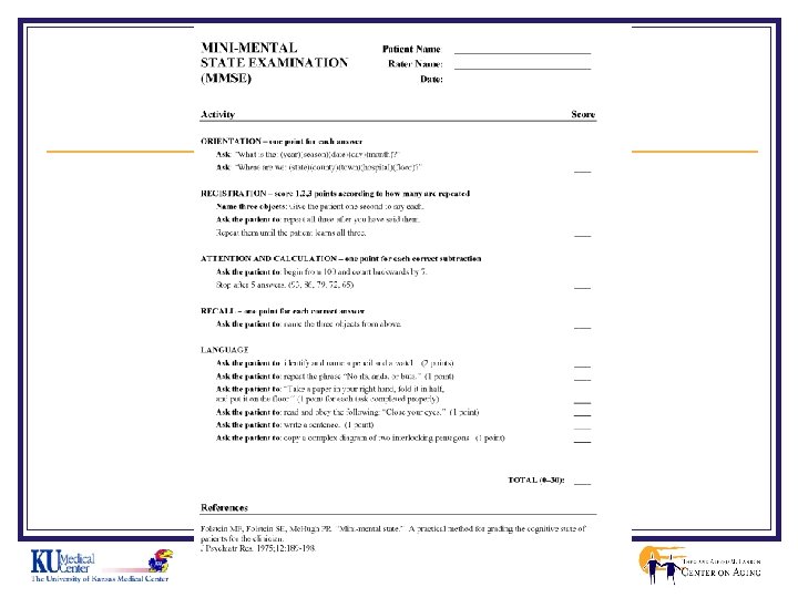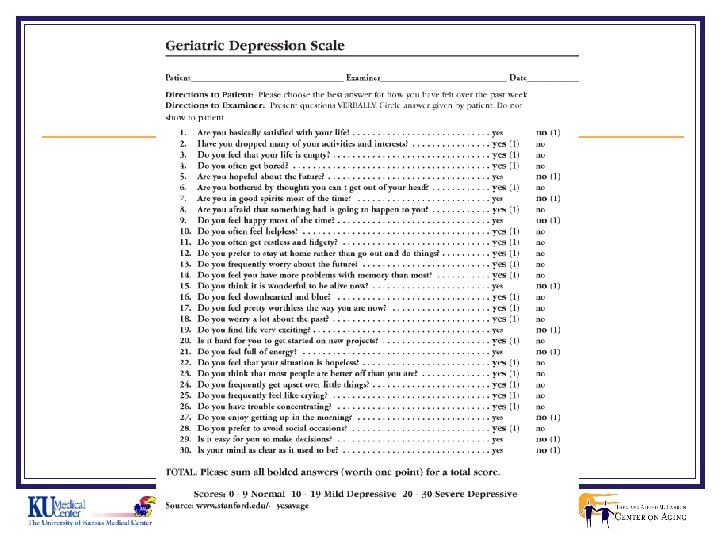 Key Terms n n n n Comprehensive geriatric assessment Depression Finger-rub test Dementia Sleep latency Sexuality Serial weights Constipation §Urinary incontinence §Activities of daily living (ADLs) §Instrumental activities of daily living (IADLs) §Mini-mental state exam(MMSE) §Geriatric depression scale (GDS) §Insomnia §Visual impairment §Hearing impairment
