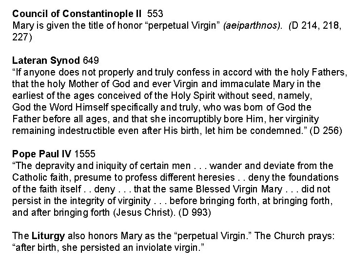 Council of Constantinople II 553 Mary is given the title of honor “perpetual Virgin” (aeiparthnos). (D 214, 218, 227) Lateran Synod 649 “If anyone does not properly and truly confess in accord with the holy Fathers, that the holy Mother of God and ever Virgin and immaculate Mary in the earliest of the ages conceived of the Holy Spirit without seed, namely, God the Word Himself specifically and truly, who was born of God the Father before all ages, and that she incorruptibly bore Him, her virginity remaining indestructible even after His birth, let him be condemned. ” (D 256) Pope Paul IV 1555 “The depravity and iniquity of certain men. . . wander and deviate from the Catholic faith, presume to profess different heresies. . deny the foundations of the faith itself. . deny. . . that the same Blessed Virgin Mary. . . did not persist in the integrity of virginity. . . before bringing forth, at bringing forth, and after bringing forth (Jesus Christ). (D 993) The Liturgy also honors Mary as the “perpetual Virgin. ” The Church prays: “after birth, she persisted an inviolate virgin. ”