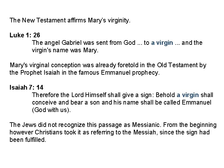 The New Testament affirms Mary’s virginity. Luke 1: 26 The angel Gabriel was sent from God. . . to a virgin. . . and the virgin's name was Mary's virginal conception was already foretold in the Old Testament by the Prophet Isaiah in the famous Emmanuel prophecy. Isaiah 7: 14 Therefore the Lord Himself shall give a sign: Behold a virgin shall conceive and bear a son and his name shall be called Emmanuel (God with us). The Jews did not recognize this passage as Messianic. From the beginning however Christians took it as referring to the Messiah, since the sign had been fulfilled.