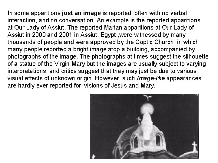 In some apparitions just an image is reported, often with no verbal interaction, and no conversation. An example is the reported apparitions at Our Lady of Assiut. The reported Marian apparitions at Our Lady of Assiut in 2000 and 2001 in Assiut, Egypt , were witnessed by many thousands of people and were approved by the Coptic Church in which many people reported a bright image atop a building, accompanied by photographs of the image. The photographs at times suggest the silhouette of a statue of the Virgin Mary but the images are usually subject to varying interpretations, and critics suggest that they may just be due to various visual effects of unknown origin. However, such Image-like appearances are hardly ever reported for visions of Jesus and Mary.