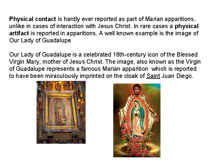 Physical contact is hardly ever reported as part of Marian apparitions, unlike in cases of interaction with Jesus Christ. In rare cases a physical artifact is reported in apparitions. A well known example is the image of Our Lady of Guadalupe is a celebrated 16 th-century icon of the Blessed Virgin Mary, mother of Jesus Christ. The image, also known as the Virgin of Guadalupe represents a famous Marian apparition which is reported to have been miraculously imprinted on the cloak of Saint Juan Diego.