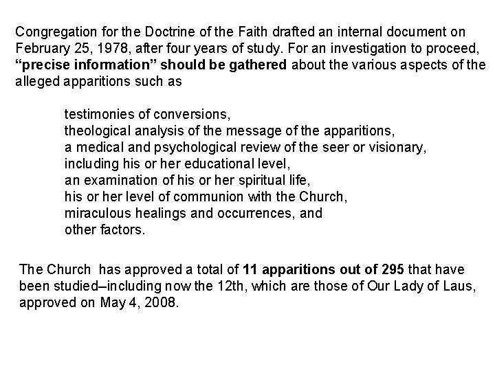 Congregation for the Doctrine of the Faith drafted an internal document on February 25, 1978, after four years of study. For an investigation to proceed, “precise information” should be gathered about the various aspects of the alleged apparitions such as testimonies of conversions, theological analysis of the message of the apparitions, a medical and psychological review of the seer or visionary, including his or her educational level, an examination of his or her spiritual life, his or her level of communion with the Church, miraculous healings and occurrences, and other factors. The Church has approved a total of 11 apparitions out of 295 that have been studied--including now the 12 th, which are those of Our Lady of Laus, approved on May 4, 2008.