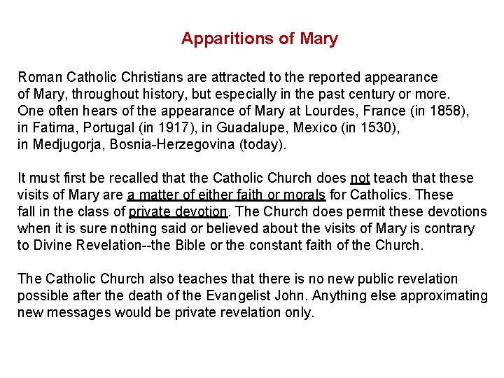 Apparitions of Mary Roman Catholic Christians are attracted to the reported appearance of Mary, throughout history, but especially in the past century or more. One often hears of the appearance of Mary at Lourdes, France (in 1858), in Fatima, Portugal (in 1917), in Guadalupe, Mexico (in 1530), in Medjugorja, Bosnia-Herzegovina (today). It must first be recalled that the Catholic Church does not teach that these visits of Mary are a matter of either faith or morals for Catholics. These fall in the class of private devotion. The Church does permit these devotions when it is sure nothing said or believed about the visits of Mary is contrary to Divine Revelation--the Bible or the constant faith of the Church. The Catholic Church also teaches that there is no new public revelation possible after the death of the Evangelist John. Anything else approximating new messages would be private revelation only.