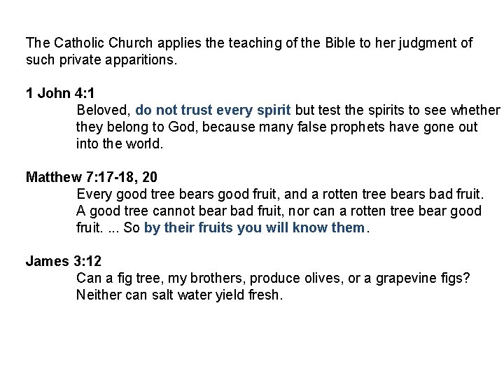 The Catholic Church applies the teaching of the Bible to her judgment of such private apparitions. 1 John 4: 1 Beloved, do not trust every spirit but test the spirits to see whether they belong to God, because many false prophets have gone out into the world. Matthew 7: 17 -18, 20 Every good tree bears good fruit, and a rotten tree bears bad fruit. A good tree cannot bear bad fruit, nor can a rotten tree bear good fruit. . So by their fruits you will know them. James 3: 12 Can a fig tree, my brothers, produce olives, or a grapevine figs? Neither can salt water yield fresh.