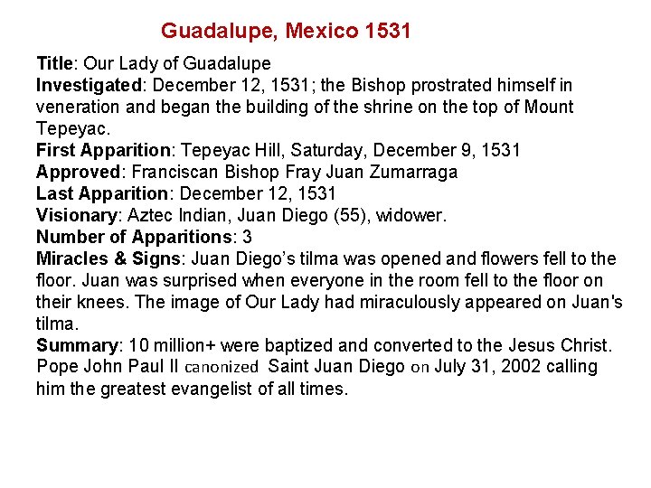Guadalupe, Mexico 1531 Title: Our Lady of Guadalupe Investigated: December 12, 1531; the Bishop prostrated himself in veneration and began the building of the shrine on the top of Mount Tepeyac. First Apparition: Tepeyac Hill, Saturday, December 9, 1531 Approved: Franciscan Bishop Fray Juan Zumarraga Last Apparition: December 12, 1531 Visionary: Aztec Indian, Juan Diego (55), widower. Number of Apparitions: 3 Miracles & Signs: Juan Diego’s tilma was opened and flowers fell to the floor. Juan was surprised when everyone in the room fell to the floor on their knees. The image of Our Lady had miraculously appeared on Juan's tilma. Summary: 10 million+ were baptized and converted to the Jesus Christ. Pope John Paul II canonized Saint Juan Diego on July 31, 2002 calling him the greatest evangelist of all times.