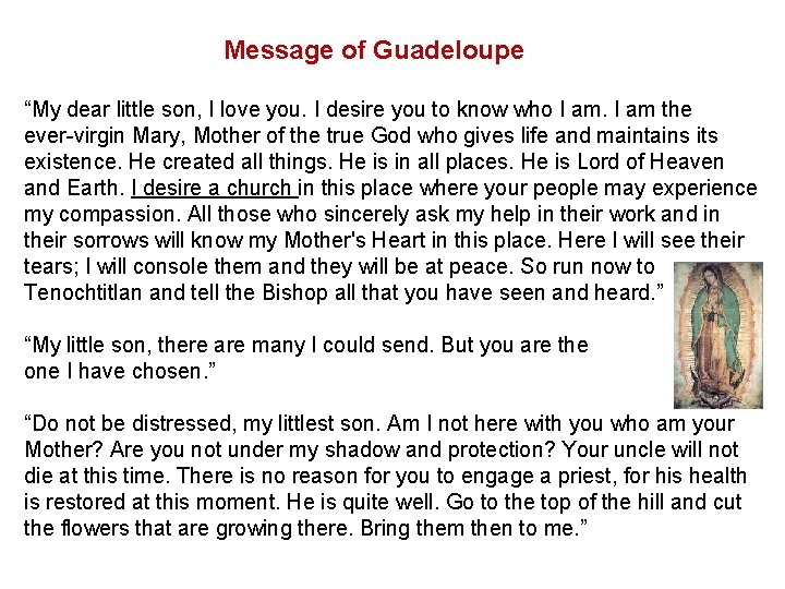 Message of Guadeloupe “My dear little son, I love you. I desire you to know who I am the ever-virgin Mary, Mother of the true God who gives life and maintains its existence. He created all things. He is in all places. He is Lord of Heaven and Earth. I desire a church in this place where your people may experience my compassion. All those who sincerely ask my help in their work and in their sorrows will know my Mother's Heart in this place. Here I will see their tears; I will console them and they will be at peace. So run now to Tenochtitlan and tell the Bishop all that you have seen and heard. ” “My little son, there are many I could send. But you are the one I have chosen. ” “Do not be distressed, my littlest son. Am I not here with you who am your Mother? Are you not under my shadow and protection? Your uncle will not die at this time. There is no reason for you to engage a priest, for his health is restored at this moment. He is quite well. Go to the top of the hill and cut the flowers that are growing there. Bring them then to me. ”