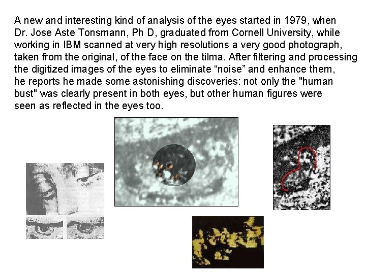 A new and interesting kind of analysis of the eyes started in 1979, when Dr. Jose Aste Tonsmann, Ph D, graduated from Cornell University, while working in IBM scanned at very high resolutions a very good photograph, taken from the original, of the face on the tilma. After filtering and processing the digitized images of the eyes to eliminate “noise” and enhance them, he reports he made some astonishing discoveries: not only the "human bust" was clearly present in both eyes, but other human figures were seen as reflected in the eyes too.