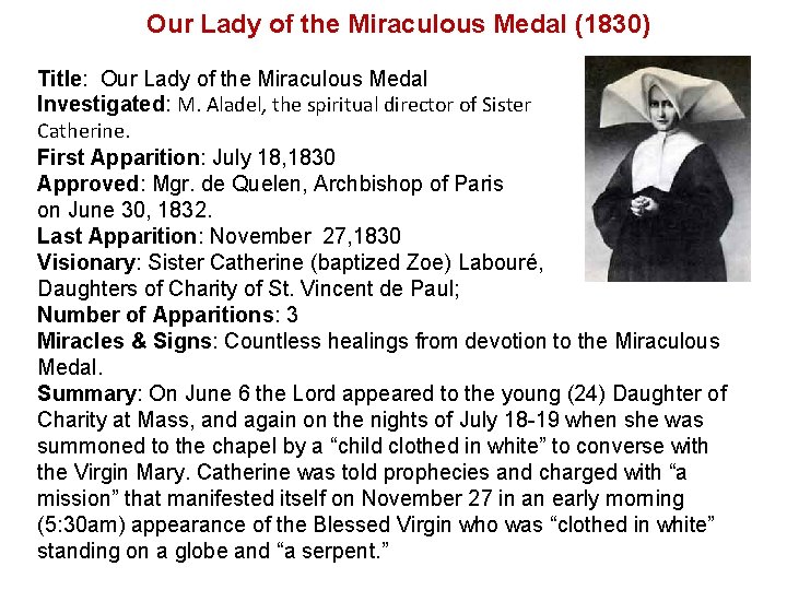 Our Lady of the Miraculous Medal (1830) Title: Our Lady of the Miraculous Medal Investigated: M. Aladel, the spiritual director of Sister Catherine. First Apparition: July 18, 1830 Approved: Mgr. de Quelen, Archbishop of Paris on June 30, 1832. Last Apparition: November 27, 1830 Visionary: Sister Catherine (baptized Zoe) Labouré, Daughters of Charity of St. Vincent de Paul; Number of Apparitions: 3 Miracles & Signs: Countless healings from devotion to the Miraculous Medal. Summary: On June 6 the Lord appeared to the young (24) Daughter of Charity at Mass, and again on the nights of July 18 -19 when she was summoned to the chapel by a “child clothed in white” to converse with the Virgin Mary. Catherine was told prophecies and charged with “a mission” that manifested itself on November 27 in an early morning (5: 30 am) appearance of the Blessed Virgin who was “clothed in white” standing on a globe and “a serpent. ”