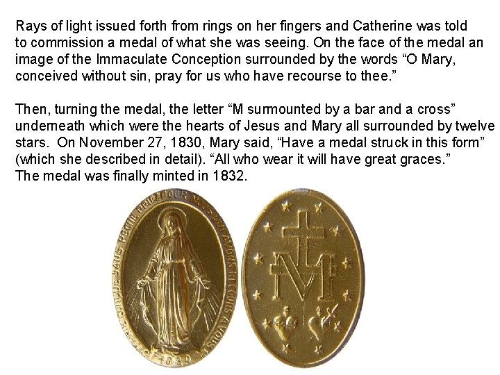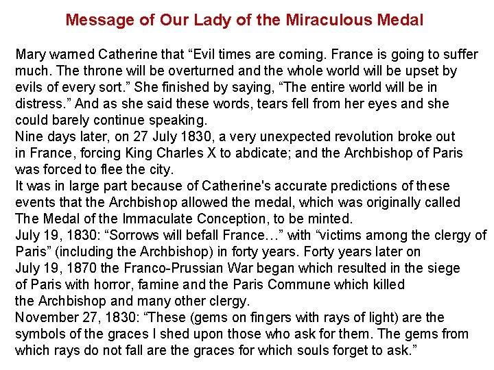 Message of Our Lady of the Miraculous Medal Mary warned Catherine that “Evil times are coming. France is going to suffer much. The throne will be overturned and the whole world will be upset by evils of every sort. ” She finished by saying, “The entire world will be in distress. ” And as she said these words, tears fell from her eyes and she could barely continue speaking. Nine days later, on 27 July 1830, a very unexpected revolution broke out in France, forcing King Charles X to abdicate; and the Archbishop of Paris was forced to flee the city. It was in large part because of Catherine's accurate predictions of these events that the Archbishop allowed the medal, which was originally called The Medal of the Immaculate Conception, to be minted. July 19, 1830: “Sorrows will befall France…” with “victims among the clergy of Paris” (including the Archbishop) in forty years. Forty years later on July 19, 1870 the Franco-Prussian War began which resulted in the siege of Paris with horror, famine and the Paris Commune which killed the Archbishop and many other clergy. November 27, 1830: “These (gems on fingers with rays of light) are the symbols of the graces I shed upon those who ask for them. The gems from which rays do not fall are the graces for which souls forget to ask. ”