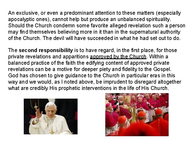 An exclusive, or even a predominant attention to these matters (especially apocalyptic ones), cannot help but produce an unbalanced spirituality. Should the Church condemn some favorite alleged revelation such a person may find themselves believing more in it than in the supernatural authority of the Church. The devil will have succeeded in what he had set out to do. The second responsibility is to have regard, in the first place, for those private revelations and apparitions approved by the Church. Within a balanced practice of the faith the edifying content of approved private revelations can be a motive for deeper piety and fidelity to the Gospel. God has chosen to give guidance to the Church in particular eras in this way and we would, as I noted above, be imprudent to disregard altogether what are credibly His prophetic interventions in the life of His Church.