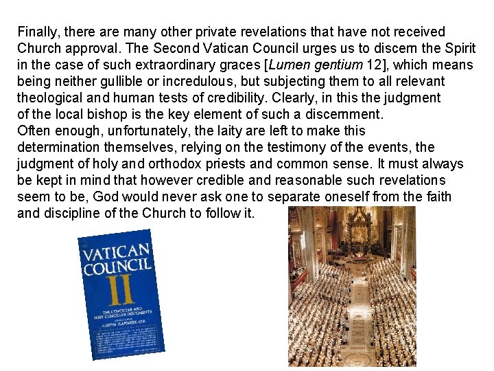 Finally, there are many other private revelations that have not received Church approval. The Second Vatican Council urges us to discern the Spirit in the case of such extraordinary graces [Lumen gentium 12], which means being neither gullible or incredulous, but subjecting them to all relevant theological and human tests of credibility. Clearly, in this the judgment of the local bishop is the key element of such a discernment. Often enough, unfortunately, the laity are left to make this determination themselves, relying on the testimony of the events, the judgment of holy and orthodox priests and common sense. It must always be kept in mind that however credible and reasonable such revelations seem to be, God would never ask one to separate oneself from the faith and discipline of the Church to follow it.