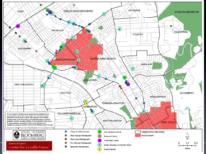 Demographics of Baltimore’s Food Deserts • 20% of city residents in food deserts, (120, 000 or 1 in 5 residents) • 1 in 4 school aged children (31, 000, 23%) • 1 in 4 of African American (105, 000 -or 26%) • 36% of Baltimore’s neighborhoods has a Food Desert in them. (100 of 278 )