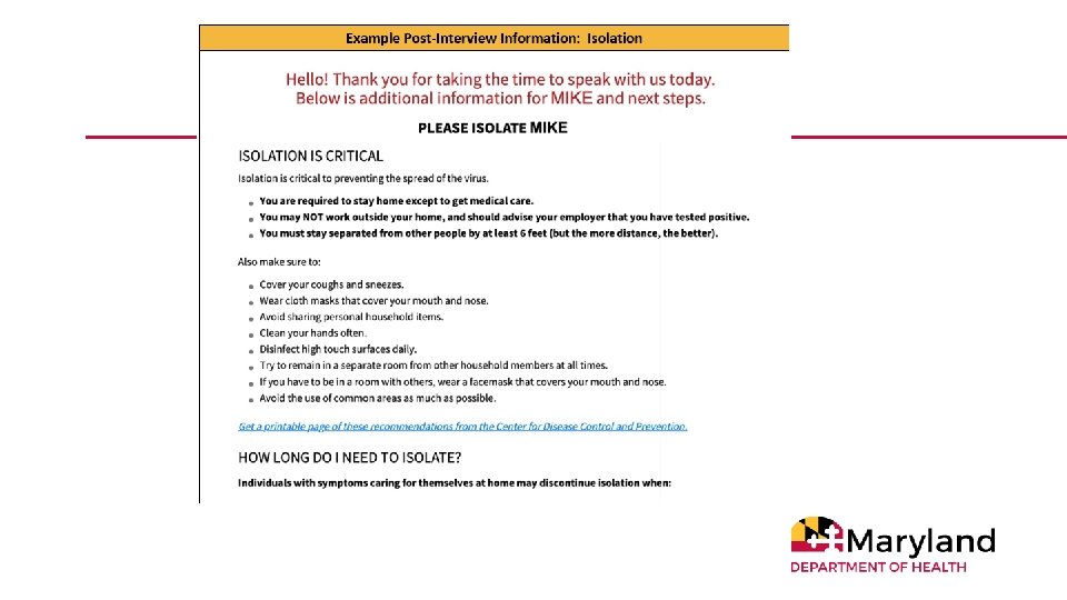 Amended Directive and Order Regarding Various Healthcare Matters (July 1) Any individual who is in one of the following categories should contact their healthcare provider to arrange to be tested: • i. Any symptomatic individual; and • ii. Asymptomatic individuals where COVID-19 exposure may be possible, including: a. Contacts of confirmed COVID-19 cases b. Residents and staff of congregate living settings and long-term care facilities c. Healthcare workers and first responders d. Patients, especially high-risk unstable patients, whose care would be altered by a diagnosis of COVID-19; • e. Individuals employed in close contact settings • f. Individuals previously in a large gathering • • • iii. Individuals who have traveled to or returned to Maryland from out-of-state travel. https: //coronavirus. maryland. gov/pages/cdc-resources 33