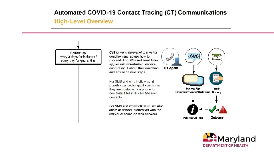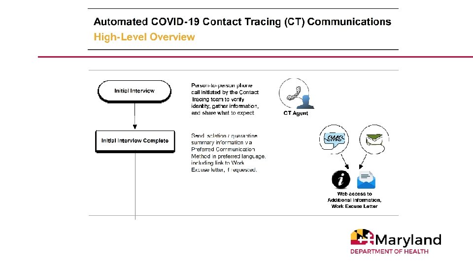 Contact Tracing in Maryland • Conducted by Maryland’s 24 local health departments and the National Opinion Research Center at the University of Chicago • 1, 350 contact tracers conduct interviews with cases and contacts • Cases are asked about their health, whereabouts during incubation period (14 days before symptom onset) and infectious period (2 days before symptom onset until current time for cases) and close contacts • Contacts are asked about their health, whereabouts • For both cases and contacts, guidance provided for isolation/quarantine including access to resources 9