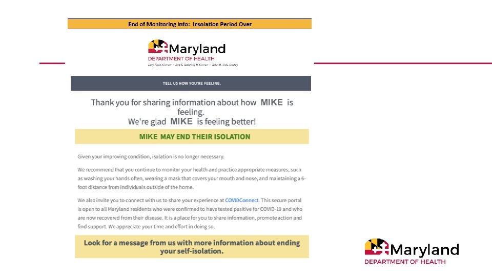 Amended Directive and Order Regarding Various Healthcare Matters (July 1) Any individual who is in one of the following categories should contact their healthcare provider to arrange to be tested: • i. Any symptomatic individual; and • ii. Asymptomatic individuals where COVID-19 exposure may be possible, including: a. Contacts of confirmed COVID-19 cases b. Residents and staff of congregate living settings and long-term care facilities c. Healthcare workers and first responders d. Patients, especially high-risk unstable patients, whose care would be altered by a diagnosis of COVID-19; • e. Individuals employed in close contact settings • f. Individuals previously in a large gathering • • • iii. Individuals who have traveled to or returned to Maryland from out-of-state travel. https: //coronavirus. maryland. gov/pages/cdc-resources 33
