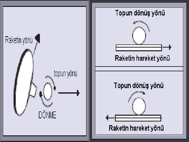 – Az ses duyulur (yumuşak ses). • Çoğu vuruş Güç ve Sürtme vuruşlarının karışımıdır. – Yavaş spinler, servisler ve kesmeler maksimum sürtme ve minimum güç vuruşlarıdır. – Hızlı spinler orta güç ve orta sürtme vuruşlarıdır. – Sert karşı vuruş ve öldürücü şutlar ise maksimum güç ve minimum sürtme vuruşlarıdır.