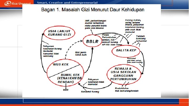 Intervensi Gizi Spesifik (langsung): • Promosi ASI • Pemberian tablet zat besi-folat • Pemberian zat penambah gizi mikro untuk anak • Pemberian obat cacing pada anak • Pemberian suplemen vitamin A • Penangan anak gizi burutk • Fortifikasi makanan • Pencegahan dan pengobatan malaria bagi ibu hamil, bayi dan anak