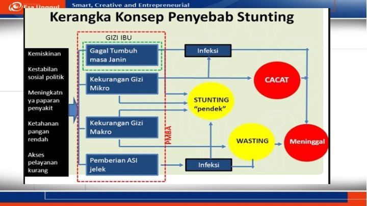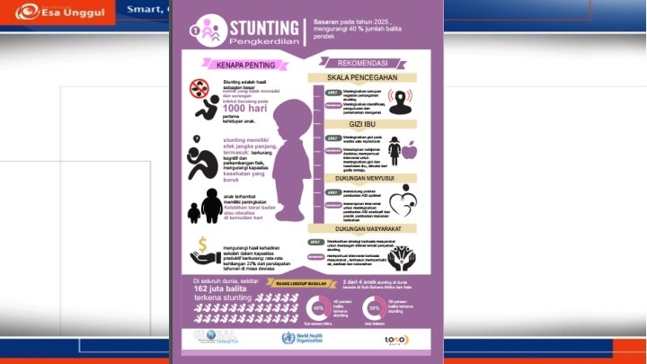 • Stunting adalah masalah kurang gizi kronis yang disebabkan oleh asupan gizi yang kurang dalam waktu yang cukup lama akibat pemberian makanan yang tidak sesuai dengan kebutuhan gizi. Stunting terjadi mulai janin masih dalam kandungan dan baru nampak saat anak berusia dua tahun. • Kekurangan gizi pada usia dini meningkatkan angka kematian bayi dan anak, menyebabkan penderitanya mudah sakit dan memiliki postur tubuh tak maksimal saat dewasa. Kemampuan kognitif para penderita juga berkurang, sehingga mengakibatkan kerugian ekonomi jangka panjang di Indonesia