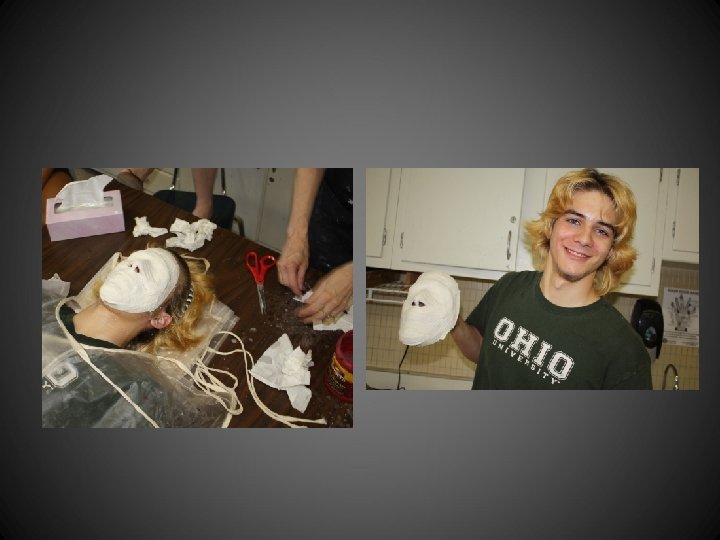 STEPS TO MAKING A MASK MOLD… 1. 2. 3. 4. 5. 6. 7. 8. 9. 10. 11. 12. 13. 14. 15. 16. 17. Pull hair up and out of the face. Place copious amounts of Vaseline on your face, chin and hairline. Meanwhile, your partner is getting wet paper towels and strips. Lay down on table. Place wet paper towels on the eyes. Begin placing strips on the face. Be sure to rub your finger making a circular motion after you lay each piece down. DO NOT place plaster over the nose holes or on the lips. BREATHE OUT OF YOUR NOSE! No laughing or moving or you’ll mess up your mask! Let rest for 15 minutes. I will peel it off of the face. Place it on a newspaper with the student’s name on it. Place it in the back room. Wash off your face and hairline. Clean up the tables!!!! Check the floors!!!!