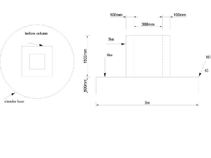 Examples • A concrete footing consists of a circular base and a hollow square column. The base has a diameter of 3, 0 m and is 500 mm thick. The external dimensions of the 1, 5 m high column are 500 mm x 500 mm with a wall thickness of 100 mm. Concrete has a density of 2 400 kg/m 3 and the footing is loaded as shown. • Calculate the pressure exerted by the concrete footing on the ground below.