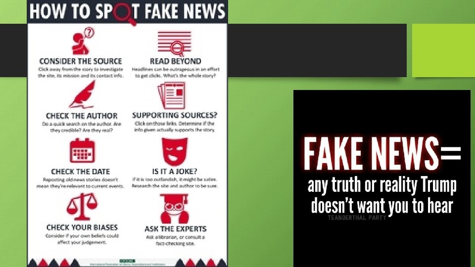 Rise of Fake News • News that has no standing in fact • Partisan sources • Purposely seek to create story that creates and emotional response • Most are conspiracy theories • Use some facts mixed with out of context quotes and information