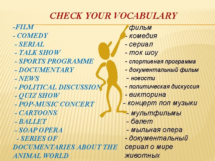 CHECK YOURSELF! 2. a. There a lot of music In this kind of programmers, we can watch singers and listen to songs b. A film with a lot of series , which is shown during a long time 1. 3. c. A discussion, where different problems are discussed by participants. They express their opinions, ask and answer questions. d. A programmer , where the announcer says what the weather will be like the next day. e. produced by recording images from the world with cameras, or by creating images using animation techniques or visual effects. 5. 4.