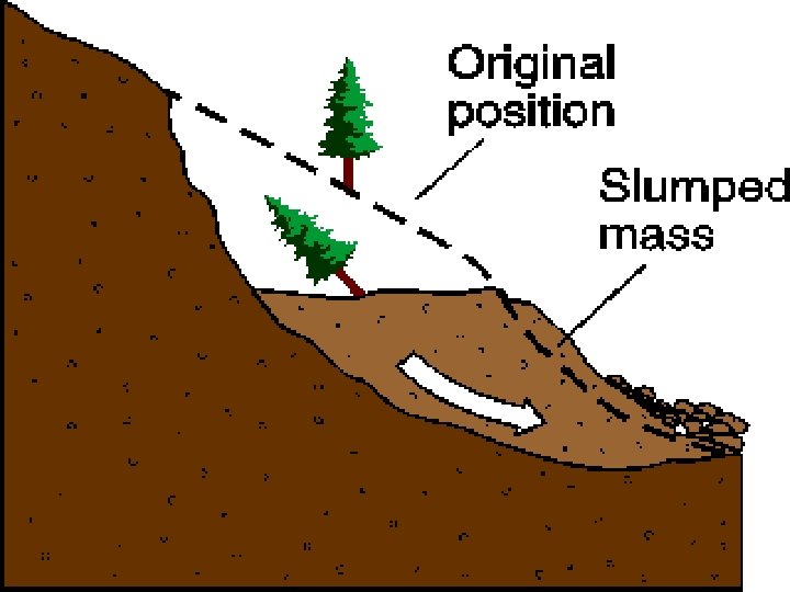 SLUMP ►Saturation of water + loss of friction causes soil below surface layer to drop downhill. ►Surface stays intact